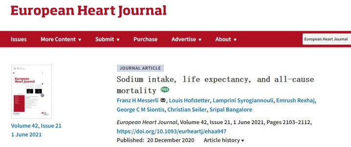 [1] Franz H Messerli, Louis Hofstetter, Lamprini Syrogiannouli, et al. Sodium intake, life expectancy, and all-cause mortality, European Heart Journal, Volume 42, Issue 21, 1 June 2021, Pages 2103–2112, Doi:10.1093/eurheartj/ehaa947